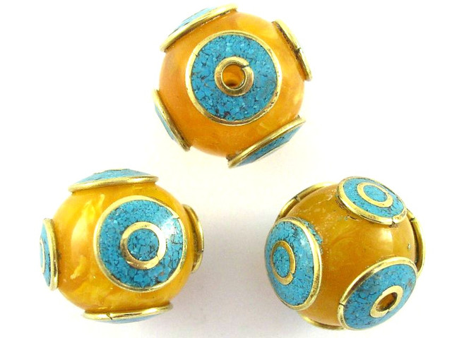 Hand crafted Tibetan bead made with amber resin and turquoise inlay. Expect some irregularity in the size and shape of this bead, as it was handmade and traditionally rustic in nature. Though the picture may show multiple beads they are sold individually and you will receive only 1.