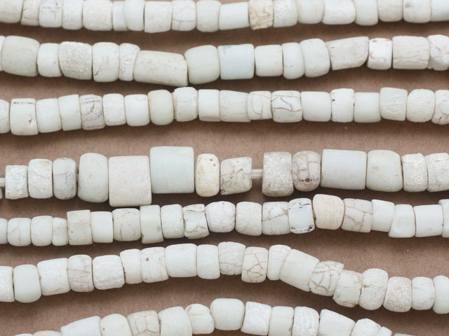 These old glass trade beads have a chalky, crackle white appearance. They are referred to as 'green hearts', however the center of the beads is the same color as the outside. They are at least 50 years old, possibly over 100 years, but in very good condition. Please expect slight imperfections in size, shape and color.